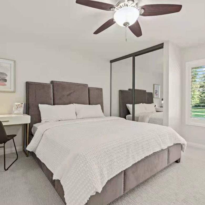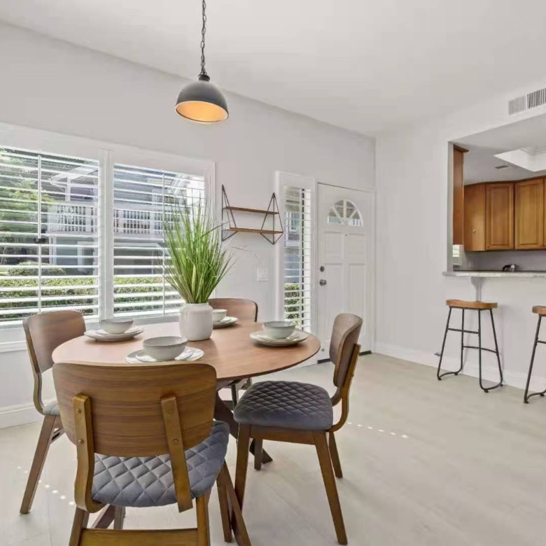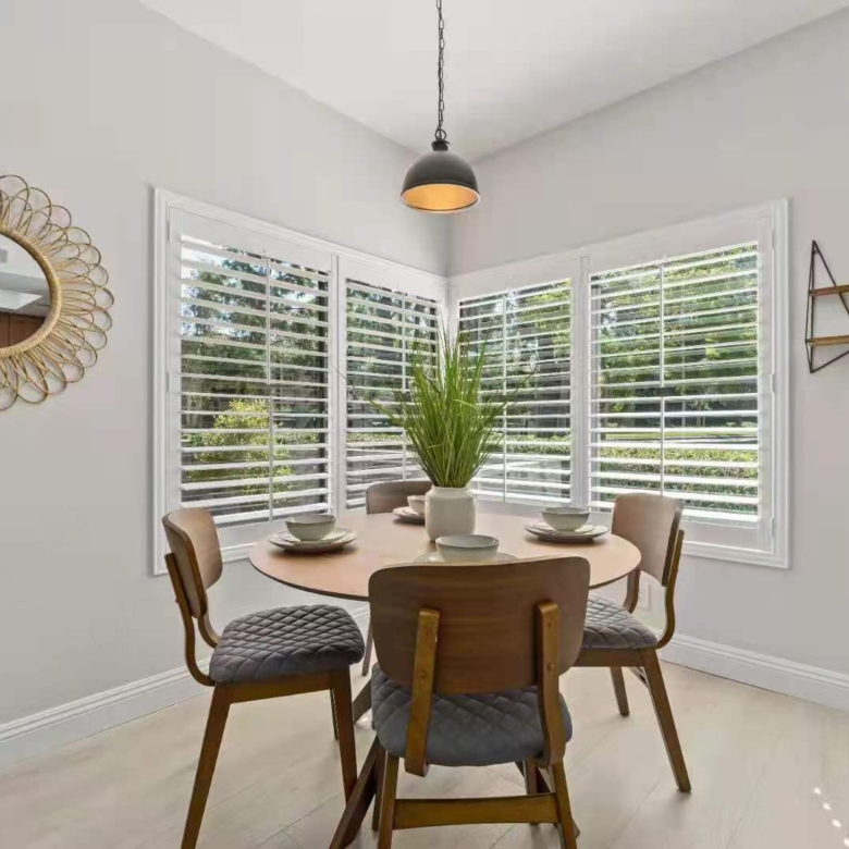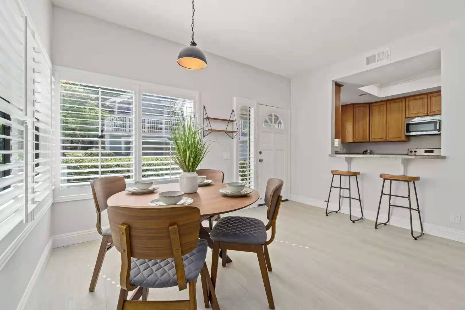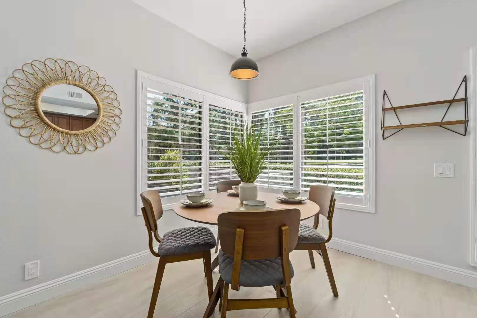 Step into a spacious living room featuring large sliding glass doors that lead to a private patio, perfect for enjoying the lush green surroundings. The dining area, adorned with oversized windows and plantation shutters, fills the home with natural light, creating a warm and welcoming atmosphere.